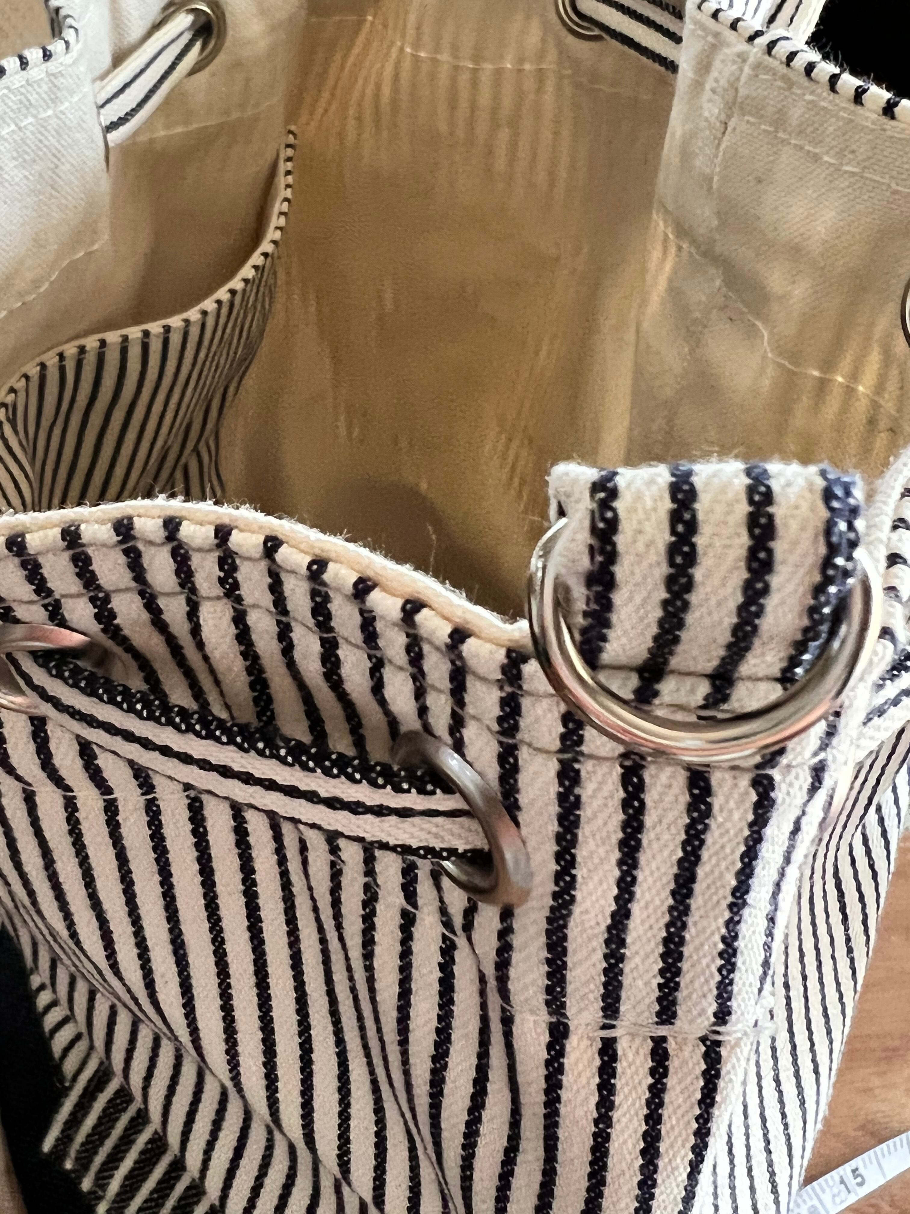 ヒッコリーとデニムを組み合わせた爽やかな巾着バックです。